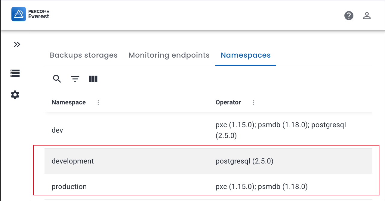 Go to Percona Everest UI and navigate to Settings > Namespaces. A list of all the namespaces that you have created will appear here.